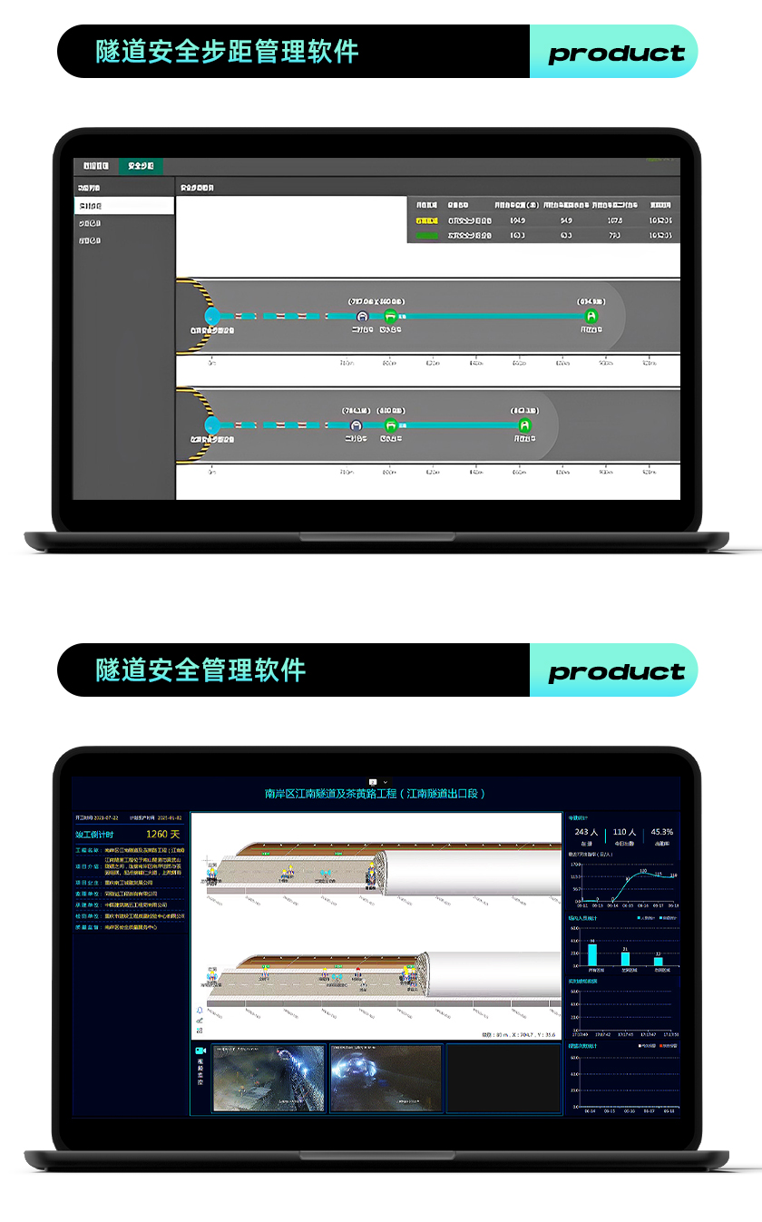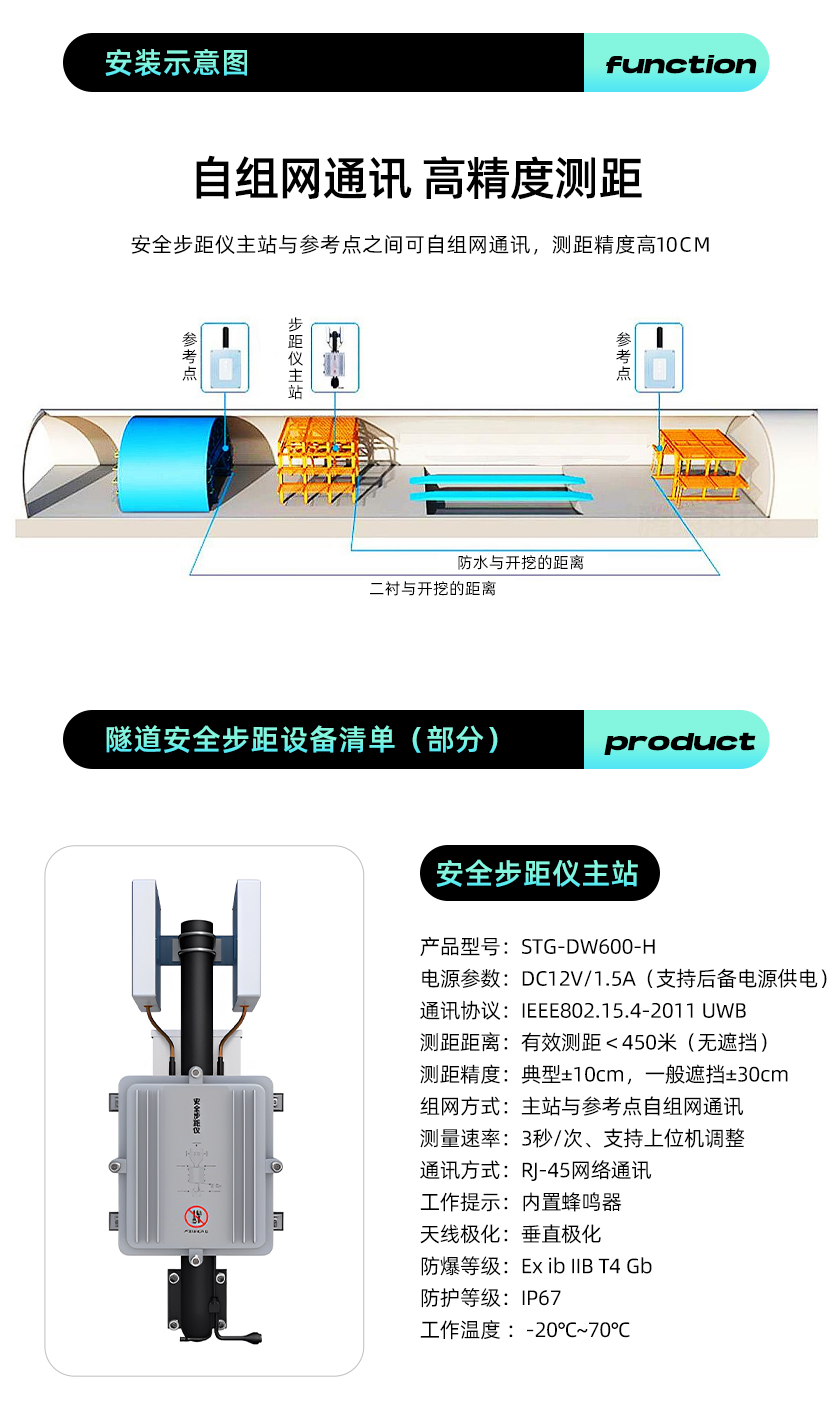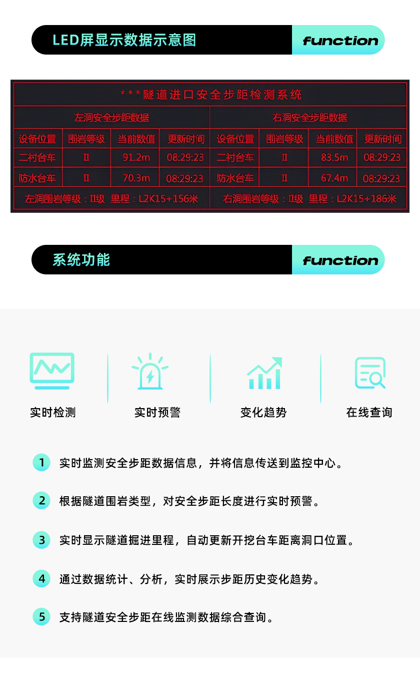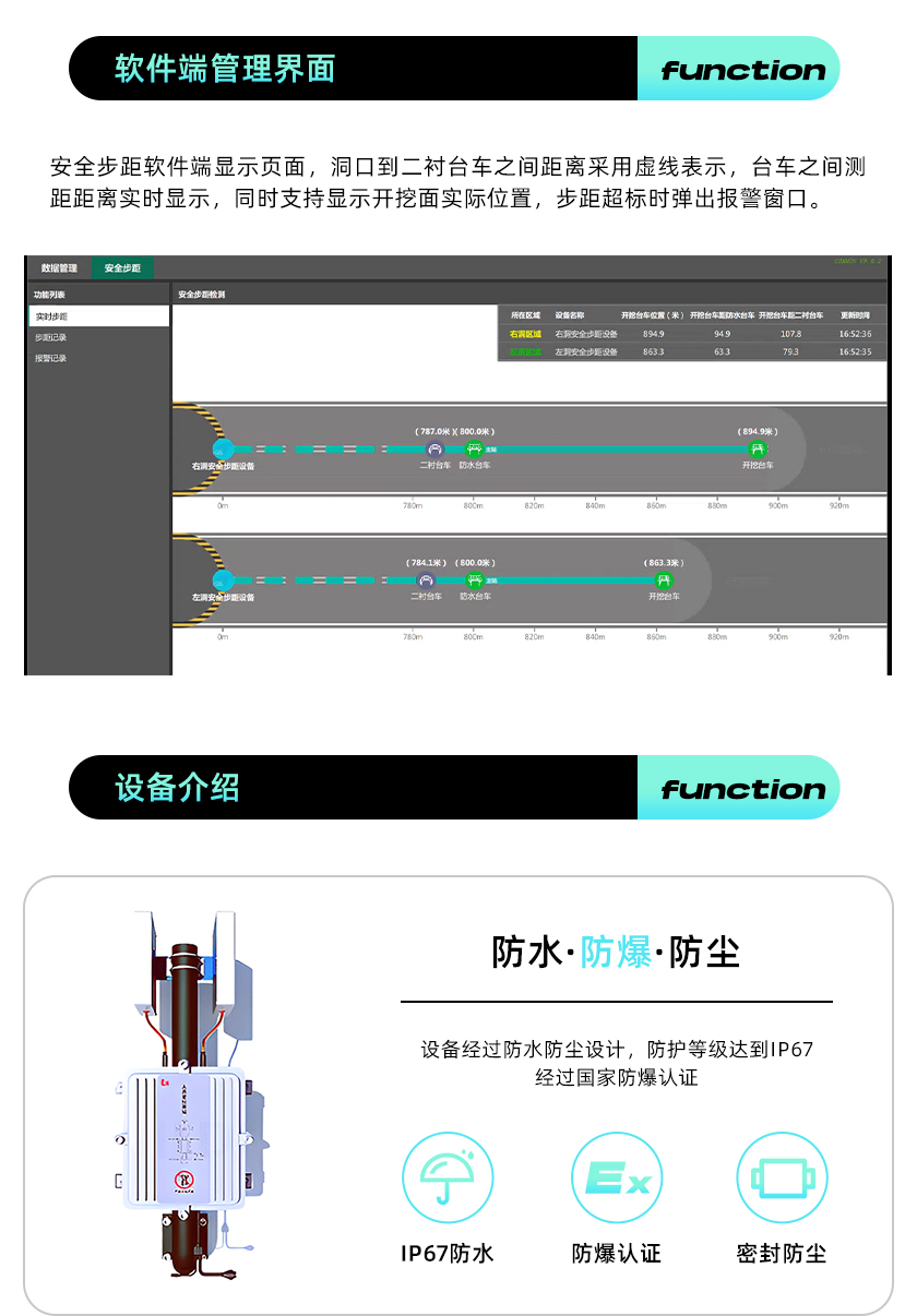 隧道安全步距儀、隧道安全步距監(jiān)測系統(tǒng)通過在二襯臺車、防水臺車(仰拱方向)和開挖臺車位置安裝基于毫米波雷達(dá)的安全步距采集終端,由采集終端將各臺車之間的測距數(shù)據(jù)通過信號傳輸設(shè)備發(fā)送至服務(wù)器,經(jīng)由公司自主研發(fā)的模型算法計(jì)算出彼此的步距關(guān)系,測距值精確到厘米級別,實(shí)時(shí)展示在隧道模擬地圖上,根據(jù)不同的圍巖級別一旦超過設(shè)定值系統(tǒng)自動預(yù)警并保存記錄,同時(shí)安全步距的數(shù)據(jù)可實(shí)時(shí)公示到現(xiàn)場的LED信息大屏。