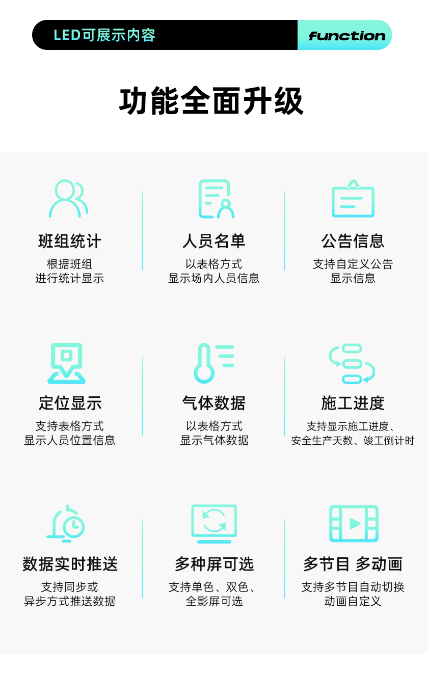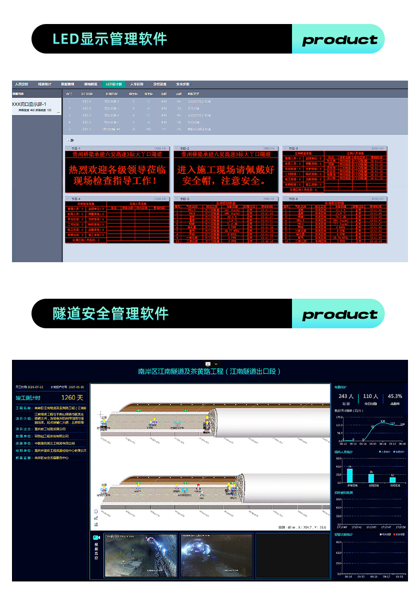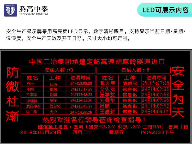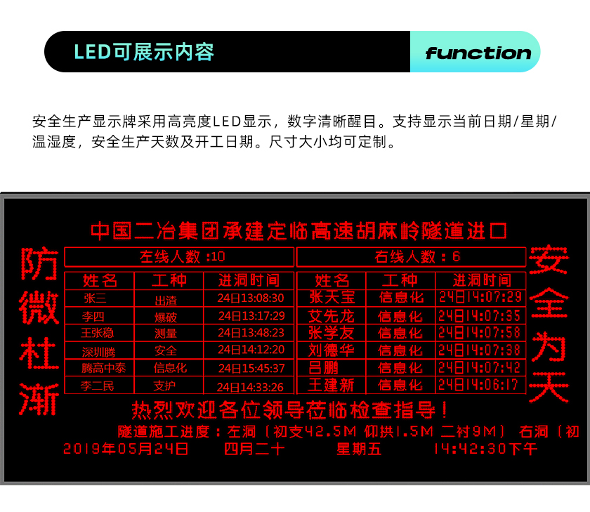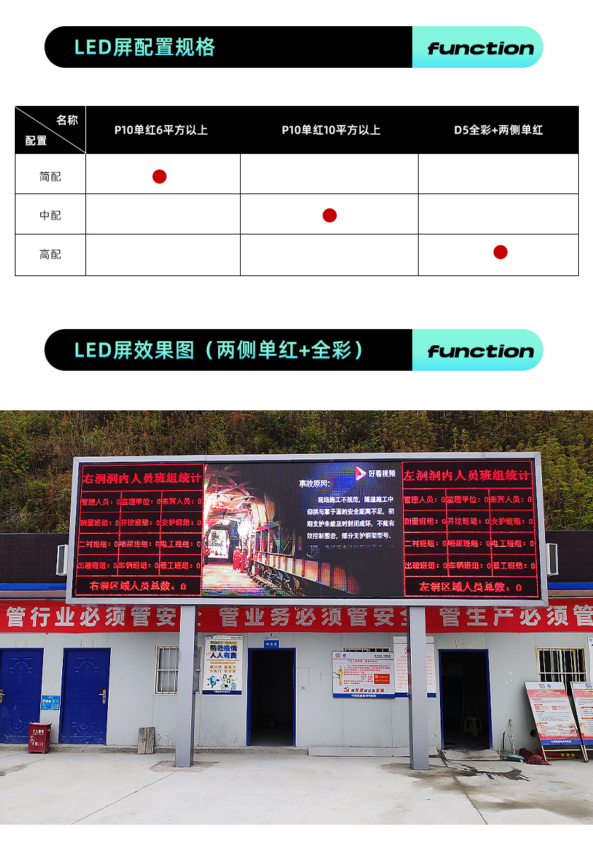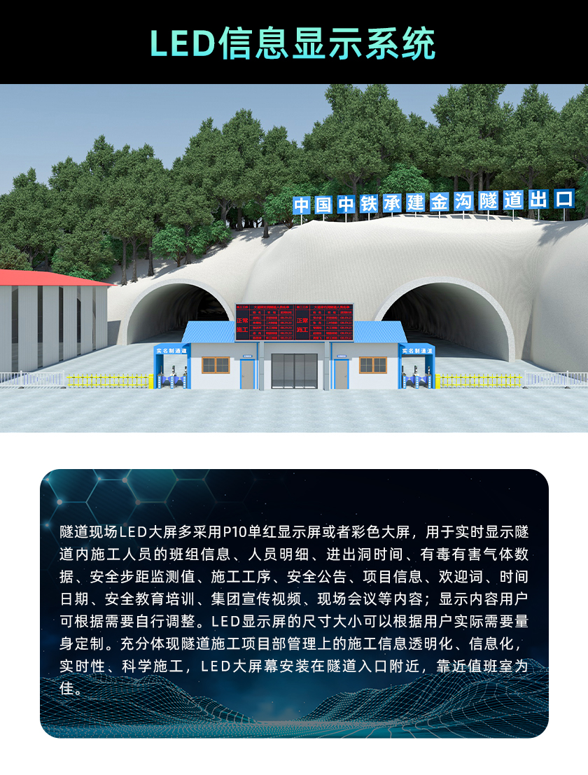 隧道LED大屏幕顯示系統(tǒng)是隧道安全管理五大系統(tǒng)之一,隧道LED大屏顯示系統(tǒng)采用P10單紅顯示屏或者彩色大屏,用于實時顯示隧道內(nèi)施工人員的班組信息、人員明細、進出洞時間、有毒有害氣體數(shù)據(jù)、安全步距監(jiān)測值、施工工序、安全公告、項目信息、歡迎詞、時間日期、安全教育培訓(xùn)、集團宣傳視頻、現(xiàn)場會議等內(nèi)容;顯示內(nèi)容用戶可根據(jù)需要自行調(diào)整。LED顯示屏的尺寸大小可以根據(jù)用戶實際需要量身定制。充分體現(xiàn)隧道施工項目部管理上的施工信息透明化、信息化,實時性、科學(xué)施工,LED大屏幕安裝在隧道入口附近,靠近值班室為佳。